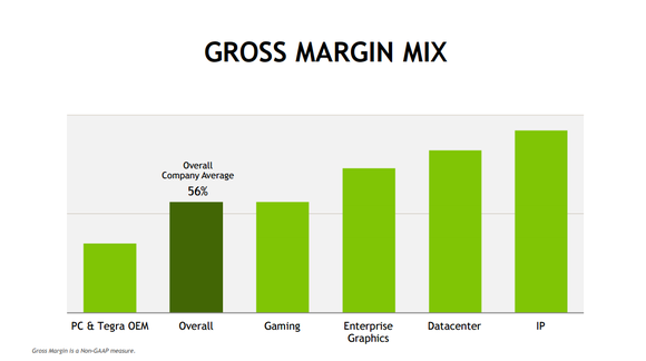 Though NVIDIA says that its gaming business essentially delivers gross profit margins right in-line with the company's overall average, that average these days is quite robust (the graphic shows that average at 56%, but that figure stood at 58.1% on a non-generally accepted accounting principles, or non-GAAP, basis in NVIDIA's most recent quarter).