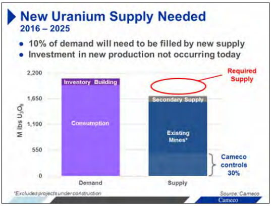 But Cameco isn't looking out six months or even a year. It's looking decades into the future. And, based on its projections, demand is set to head higher. For example, there are 60 reactors under construction right now, most of which should come on line in the next few years. That, in turn, is expected to create the need for the uranium mining industry to build new mines to meet future demand.