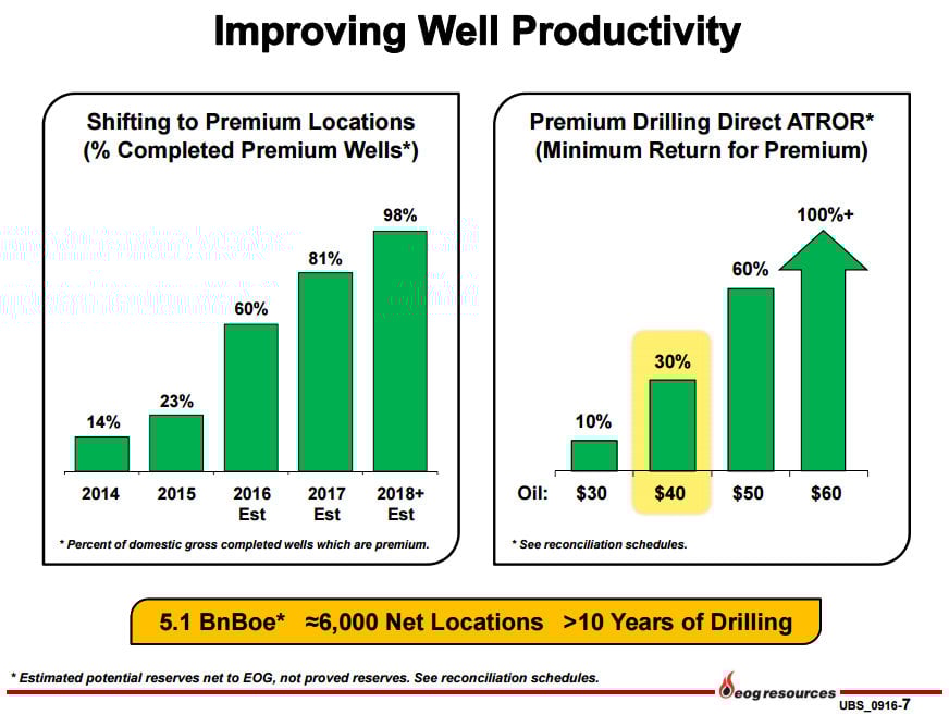 That said, where the economics start to get compelling is when crude reaches $50 a barrel. As the slide below shows, that incremental $10 per barrel doubles EOG Resources' drilling returns on premium wells: