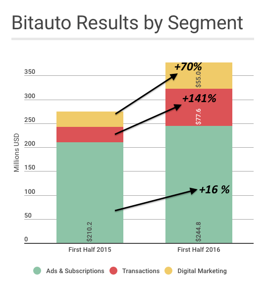 While there are officially three segments to Bitauto's business, it's clear where the growth is coming from: transactions and digital marketing.