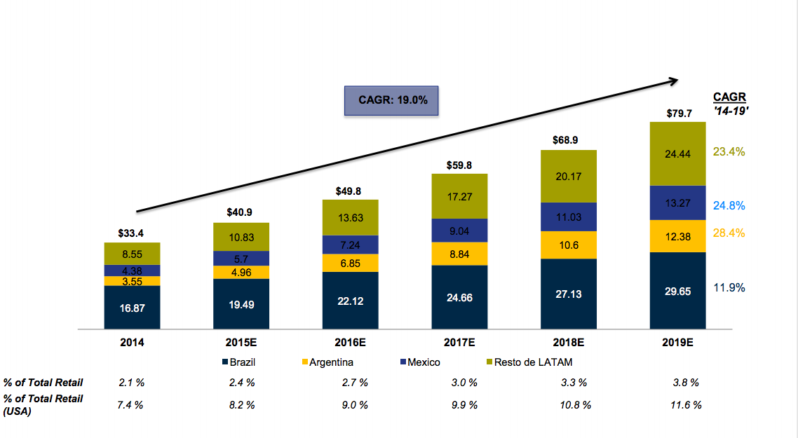 E-commerce in Latin America has been fertile ground for growth over the years, and it still has significant room for expansion. Based on data from Euromonitor International, online commerce in Latin America is expected to expand at a compounded annual rate of 19% from 2014 to 2019.