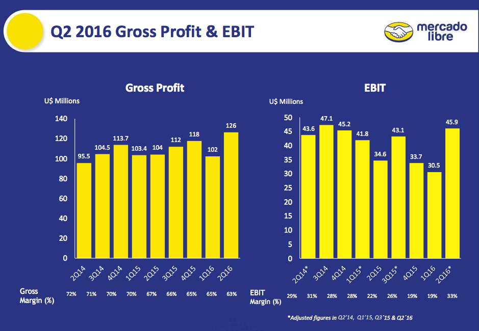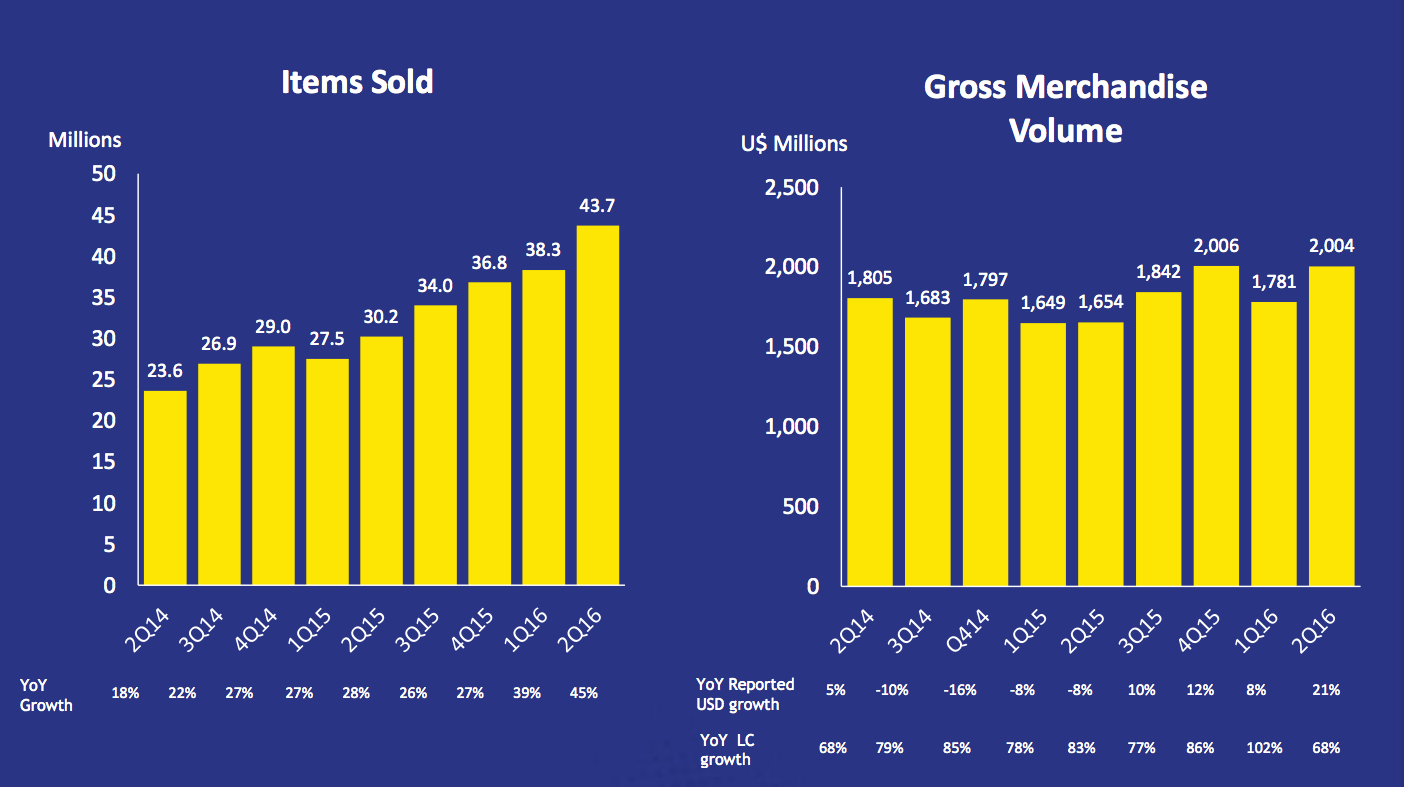 Fortunately for investors, MercadoLibre is looking stronger than ever from this point of view, and growth is even accelerating. Items sold hit 43.7 million in the second quarter of 2016, up 45% from Q2 2015 -- the highest growth rate the company has experienced since 2009. Gross merchandise volume was over $2 billion, growing 21.2% in U.S. dollars and up by 67.9% in local currencies.