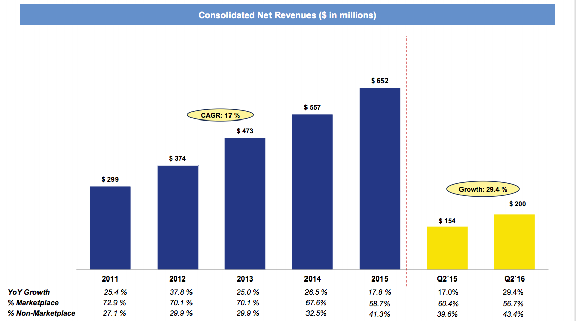 The company is effectively translating healthy operational performance into growing sales and earnings for investors. Net revenue in U.S. dollars has increased at 17% annually from 2011 to 2015, and the year-over-year increase in Q2 2016 was an even stronger 29.4%. In constant currency terms, sales grew 72.5% year-over-year during the quarter.