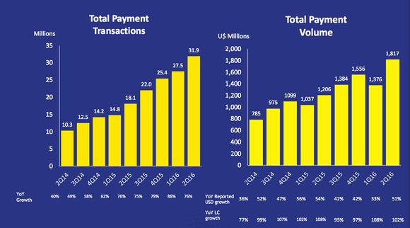 The payments business is also firing on all cylinders. The company processed 31.9 million transactions in the second quarter, growing 76% versus the same period in the prior year. MercadoPago's on-platform penetration reached a record high of 75%, approximately 20 percentage points higher than in the second quarter of 2015. Total payment volume was $1.8 billion, a year-over-year increase of 50.6% in U.S. dollars, and of 101.6% in local currencies.