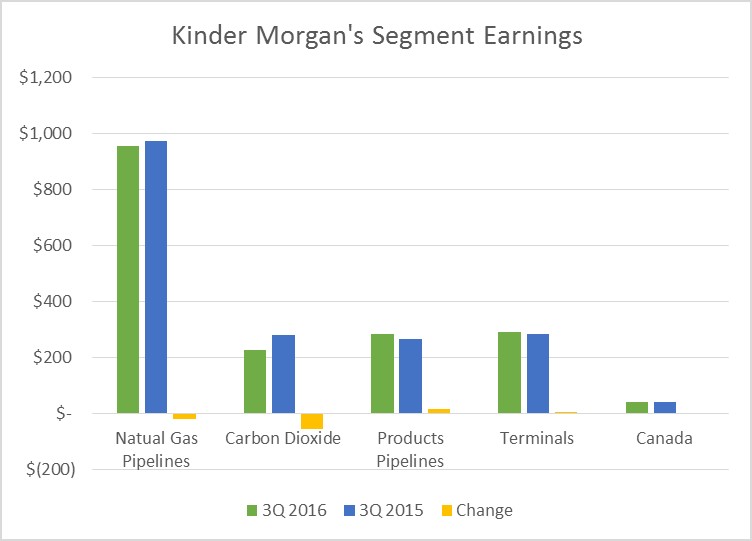 - Earnings in the company's natural gas pipeline segment edged down 2% after adjusting for certain items. Without those adjustments, which include the impact from the sale of its 50% interest in the Southern Natural Gas (SNG) pipeline to Southern Company (SO +0.89%), earnings slumped 46% to $540 million. That said, on an apples-to-apples basis, earnings were in line with expectations. Positive drivers of that in-line result were incremental revenue from expansion projects at Tennessee Gas Pipeline and increased contributions from the Hiland midstream assets and the Texas Interstate Natural Gas pipelines. However, reduced volumes across some of its gathering and processing assets, unfavorable contract renewals on the Colorado Interstate Pipeline, and a customer contract buyout on the Kinder Morgan Louisiana pipeline more than offset those incremental contributions.