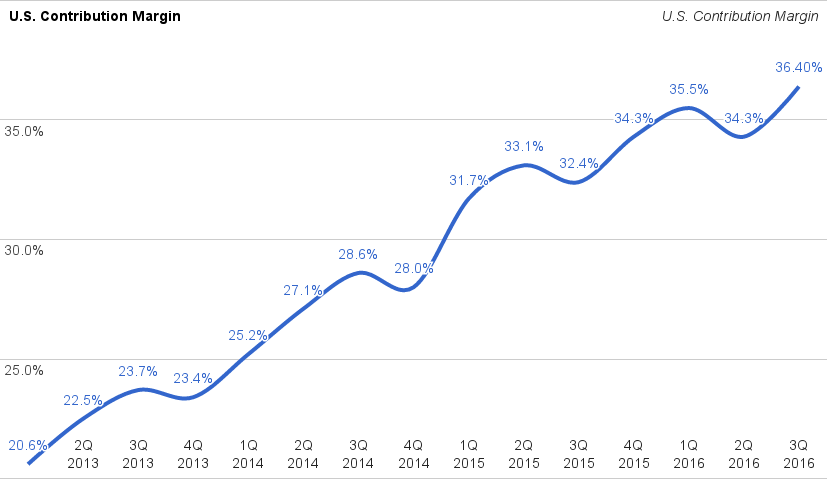 The U.S. market is maturing, and Netflix is proving its ability to drive expanding profitability in this market. Contribution margin in the U.S. reached 36.4% in the third quarter of 2016, a substantial increase versus 32.4% in the same period last year. Looking into the future, management believes the business is well on track to generating a contribution margin around 40% of revenue in the U.S. by the year 2020.