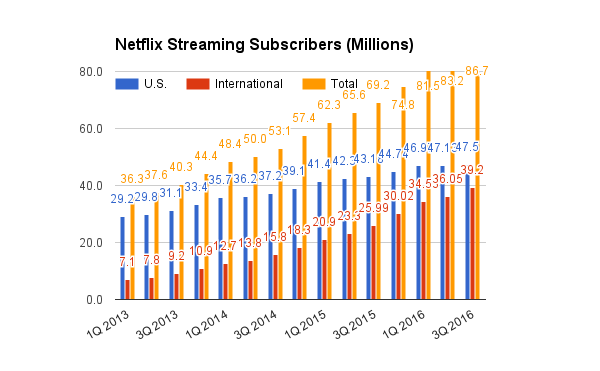 The company ended the third quarter of 2016 with 86.7 million streaming members, outperforming management's guidance for 85.5 million subscribers. Growth was above expectations both in the U.S. and in international markets. Netflix gained 0.4 million new members at home versus 0.3 million expected by management, and the company added 3.2 million international subscribers versus management forecasts for 2 million net additions.