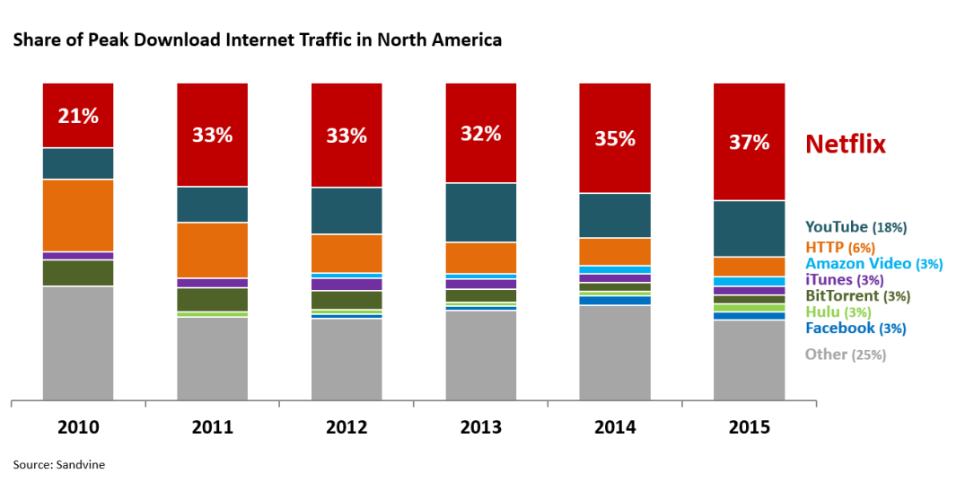 In Netflix's letter to shareholders for the second quarter of 2016, management referenced the following chart from Sandvine, which shows that Netflix is the undisputed leader in the industry as measured by download internet traffic.