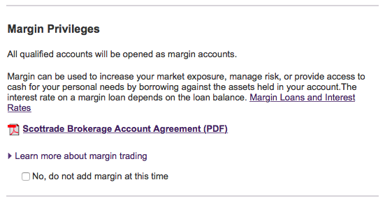 After you've reviewed your account, Scottrrade will offer you two additional services to add to your brokerage account: margin privileges and options privileges.