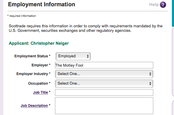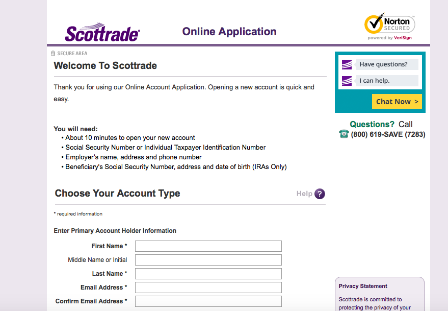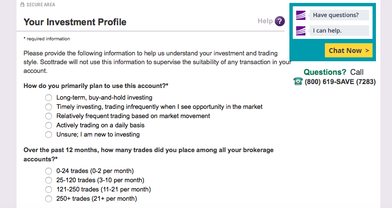 It's worth noting here that you can click the "Chat Now" link at the top right side of the screen at any time during the online application process to ask a Scottrade representative questions about the application process. I also found the chat box randomly appeared a couple of times throughout the process, presumably if I took a while to fill out certain parts of the application.