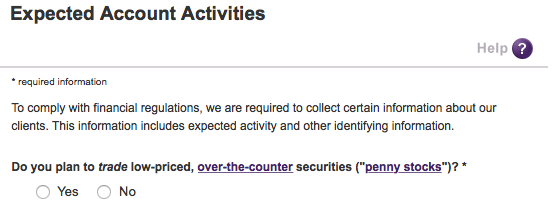 After you've decided if you want those two services, you'll be asked whether you'll be trading in penny stocks (hint: not a great idea) and how you'll be funding the Scottrade account (i.e., through wages, a savings account, a gift, etc.).