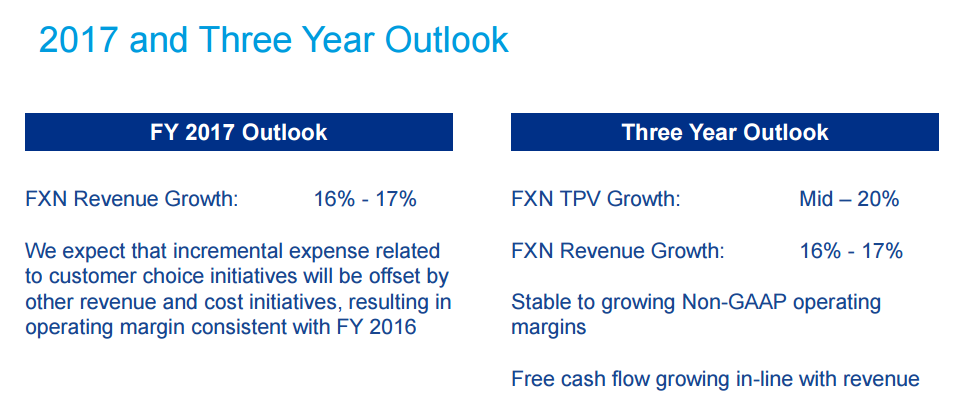 PayPal wants to communicate to shareholders that its impressive growth won't abate anytime soon. Alongside third-quarter earnings, management shared a three-year outlook (through 2019), outlining broad expectations. Note that "FXN" stands for currency-neutral -- that is, numbers presented before currency effects are factored in: