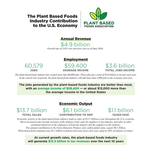 According to the Plant Based Foods Association, plant-based foods generated $4.9 billion in sales over the 12-month period ending this past June, up 3.4% from the same time frame a year ago. (The fact that there is even a trade group indicates how much the niche is growing.) It estimates that at current growth rates, plant-based foods will end up contributing more than $13 billion in tax revenues over the next decade, but investments from big players like Tyson Foods could drive that number higher.