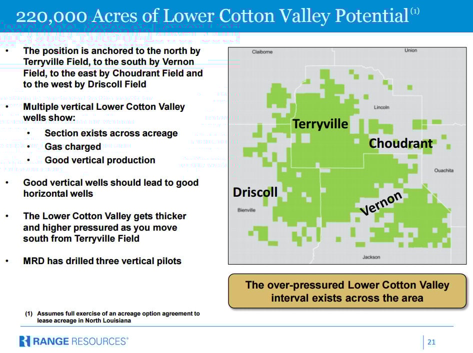 It is a relationship that Range Resources assumed when it acquired Memorial Resource Development earlier this year, making it a key acreage holder in the Terryville Complex. As the slide below shows, Range now holds a vast acreage position in the region: