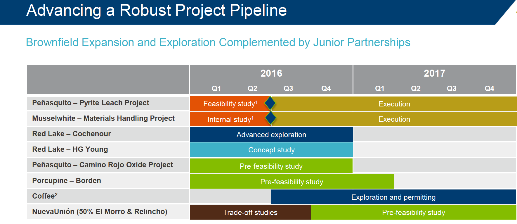 Management estimates that both the Penasquito Pyrite Leach Project and Musselwhite Materials Handling Project will begin commercial production in the first quarter of 2019. The pipeline, in and of itself, means little; however, if the company proves successful at executing the projects at Penasquito and Musselwhite, it would certainly indicate that the pipeline is an asset which could prove valuable for the company for many years to come.