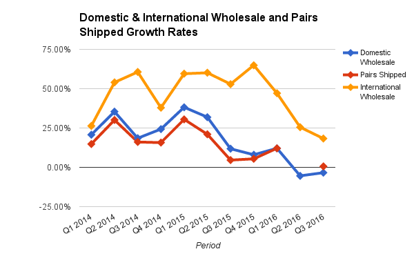 The falloff in growth in domestic wholesale repeated its gut-wrenching drop in the first quarter: Growth rose just 12% this time, for a 68% drop in the growth rate, until finally turning negative in the second quarter when sales actually fell 5.4% from 2015. That it's negative once again in the third quarter shows just how much this footwear company's business has shriveled.