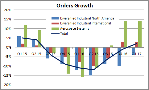 Before you get too excited by the 14% growth rates in aerospace systems, which helped lift orders into growth territory, it's worth noting that on the recent earnings call, CEO Tom Williams recognized that this was due to the normal lumpiness of aerospace orders. Nevertheless, he expects aerospace systems to grow at around 4% in the next three to five years. That's a good growth rate in a slow economy, and both General Electric and Alcoa (AA +0.00%) confirmed the underlying strength in the aerospace industry in recent results.