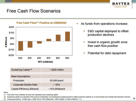 We can also infer from the chart that the company will not be in the position to grow its output until crude reaches $60 or more. Contrast this with EOG Resources, which would be able to ramp up its growth rate to 20% compounded annually at $60 oil. Needless to say, Baytex Energy still has some work to do so that it can thrive at lower prices like EOG.