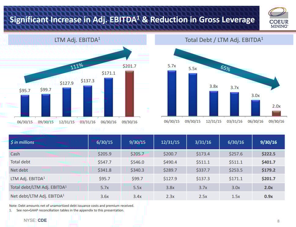 As a result of the debt reduction during the quarter and its rising earnings, Coeur has reduced its total debt-to-LTM adjusted EBITDA to 2.0 times. Further, when adding in its $222.5 million cash balance, that metric falls to just 0.9 times. That is a tremendous amount of progress over the past year: