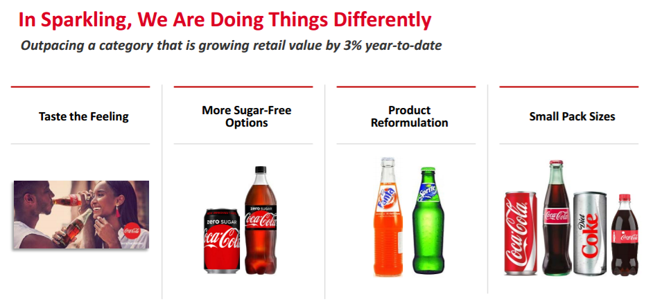 Stripping the company into its core businesses and removing the burden of distribution from operations are likely to reveal a more agile and profitable company going forward. It will also allow Coca-Cola's management to focus on solving its most pressing problems, such as the persistent issue of muted sparkling beverage sales. In fact, some of this focus is already apparent, as seen in the following slide, which details current strategy on this topic: