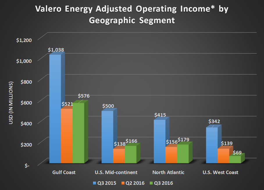 *Adjusted operating income is defined as operating income excluding lower of cost or market inventory valuation adjustment and asset impairment loss. Data source: Valero Energy earnings release.