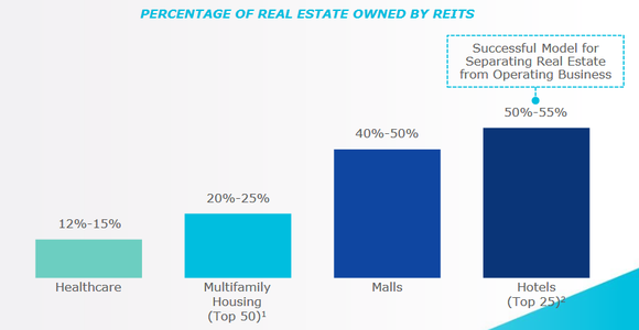As Ventas pointed out in a recent presentation, the healthcare real estate industry is still in the early stages of the trend toward securitized public real estate. Less than 15% of healthcare properties are owned by REITs -- a remarkably low figure when you consider that 40%-50% of malls and 50%-55% of hotels are owned by REITs.