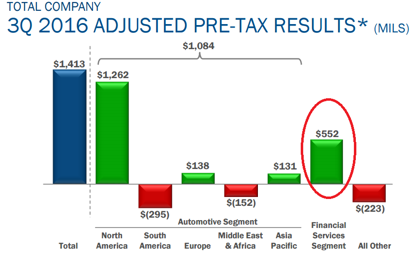 Ford Credit put up its best quarterly pre-tax profit since 2011, up 5% compared to Q3 2015, to $567 million. That result was driven in part by a 9% increase in net receivables and a 10% jump in managed receivables. Also, in case anybody is concerned that Ford Credit might be taking on riskier consumers, its average FICO placement score increased two points to 743.