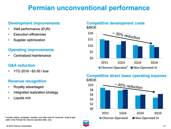 Typically, Chevron's earnings releases and press conferences are rather dull affairs, but this quarter, the company went into quite a bit of detail about its U.S. shale production in the Permian Basin. Aside from its massive holdings in the basin -- north of 2 million acres -- the company has been driving down costs rather quickly. According to Bruce Niemyer, vice president of U.S. mid-continent operations: