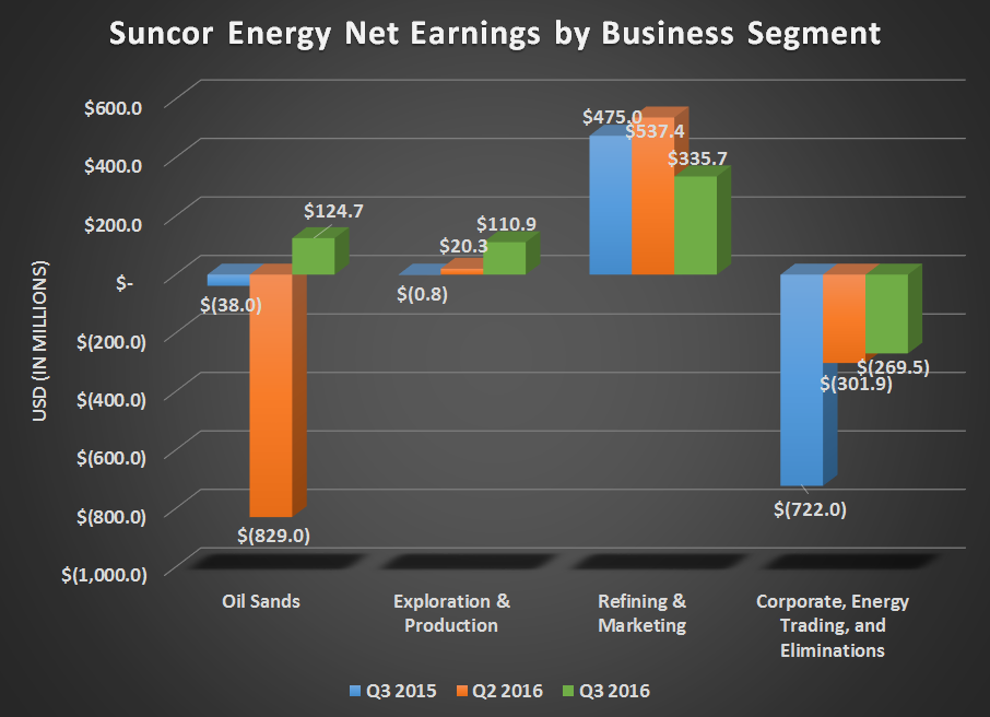 - Refinery throughputs also increased thanks to higher utilization, improved reliability, and less maintenance. The overall results for the segment decreased because of lower refining margins, though. Investors can expect a decline in refining this coming quarter, as planned maintenance will result in downtime at Suncor's Montreal and Sarnia refineries.