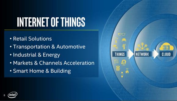 Although IoT is something of a catch-all term for a wide variety of applications, Intel's IoT business -- per a company presentation last year -- focuses on delivering platforms (that is, processors and other related components) into the areas shown in the following slide: