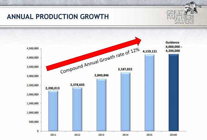 In 2011, Great Panther Silver produced around 2.2 million ounces of silver. In 2015, it produced about 4.1 million ounces. That's a compound annual growth rate of around 12%. Impressive by any stretch of the imagination, particularly since Barrick's precious-metals production fall 20% over the same time span.