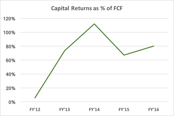 It should be intuitively obvious that returning greater than 100% of free cash flow is unsustainable in the long run (Apple actually did this in fiscal 2014, returning 112% of free cash flow). The good news is that in the two fiscal years since, Apple has brought this percentage down to a more sustainable level. Apple returned 67% of free cash flow in fiscal 2015, and 80% of free cash flow in fiscal 2016. A comfortable level is anywhere in the 70% to 80% range.