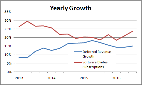 As you can see below, deferred revenue growth continues at a very strong clip, as does software-blade revenue. For reference, software-blade subscriptions made up 23.1% of revenue compared to 19.7% in the same period last year.