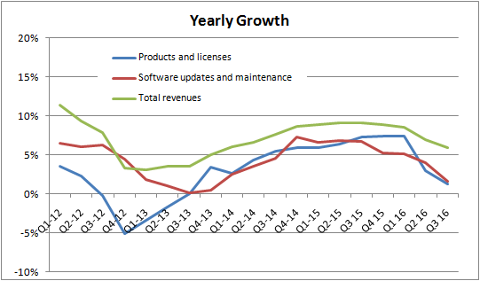 It's important to recognize the importance of the shift to deferred revenue, because on a superficial basis revenue growth is slowing. In addition, as you can see below, revenue growth in products and licenses -- the key to future software updates and maintenance growth -- appears to be slowing. However, recall that as Check Point increases the software blades bundled with product appliances, it becomes less important to purely look at products and licenses sales growth.