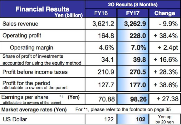 The chart below, provided by Honda, shows how its results for the quarter ended Sept. 30 compare with the year-ago period. Note that Honda's fiscal year starts on April 1; the most recent quarter is the second quarter of its 2017 fiscal year.