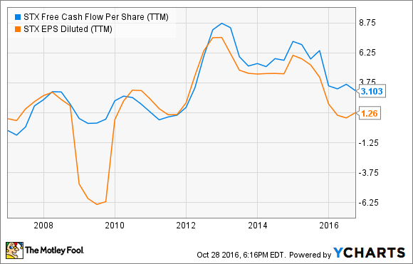 Seagate's earnings per share and free cash flow per share track very closely. Image source: YCharts.