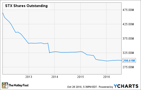 Aggressive buyback activity has reduced Seagate's share count significantly since 2012. Image source: YCharts.