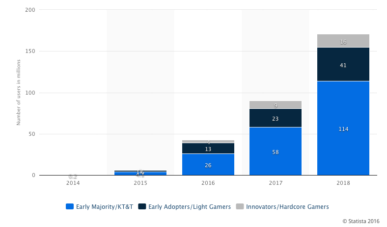 Worldwide, there are about 43 million VR users right now, but that number's expected to balloon to 171 million just two years from now.