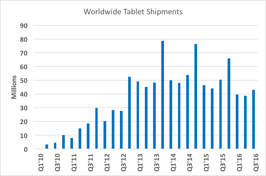 For a product category this young, it's a bit discouraging to see it continue to shrink. It was only in 2010 that Apple (AAPL +1.08%) kicked off the tablet renaissance with the original iPad, and for a while there it looked like tablets had a lot of potential to disrupt the PC market. The mobile revolution was in full swing, and having a "giant iPhone" wasn't really a bad thing. Once upon a time, I even thought that the iPad would one day overtake the iPhone in terms of revenue, but that was when the tablet was on a strong upswing driven by adoption. Little did I know that worldwide tablet shipments would peak less than a year later.