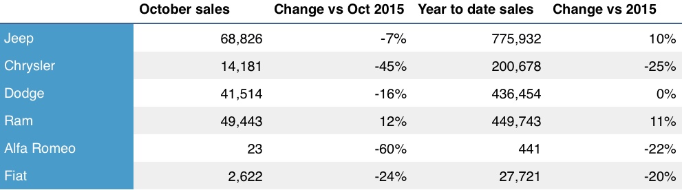 Like most of its rivals, FCA was hurt in October by a quirk of the calendar: Last month had two fewer selling days than October of 2015. (Selling days exclude Sundays and other days when dealerships tend to be closed.) The overall U.S. market is expected to be down as much as 8% once all automakers' results are tallied.