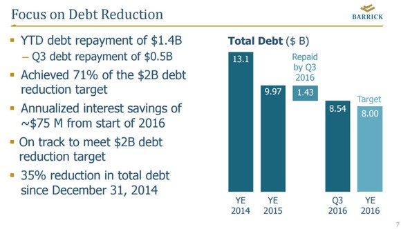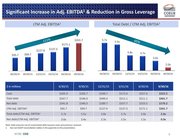 Barrick Gold is one of a handful of miners using its growing free cash flow from improving precious metal prices and falling costs to deliver a meaningful reduction in leverage. Another example is leading U.S. silver producer Coeur Mining (CDE 2.36%), which is turning its balance sheet from a liability to an asset. As the following slide shows, Coeur Mining's total debt is down 65% since June of 2015: