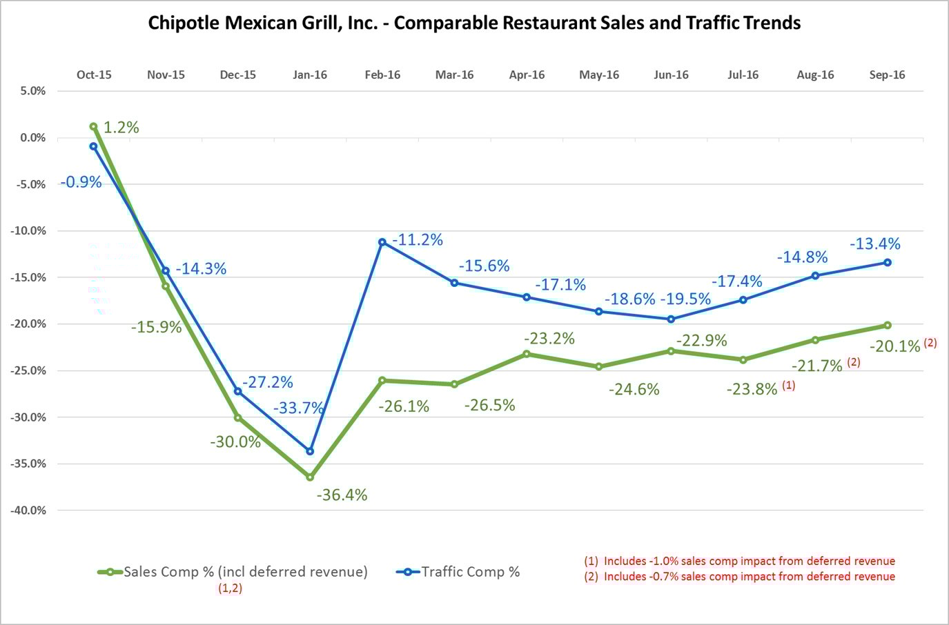 Chipotle reported a 14.8% decline in revenue during the third quarter of 2016, to $1 billion. Comparable-store sales fell 20.1% year over year, while comparable traffic declined 13.4% from the third quarter of 2015. The company is still making money, but restaurant-level operating margin declined by more than half, from 28.3% to 14.1%. When looking at these numbers, it's easy to understand why investors in Chipotle are going through so much pain.