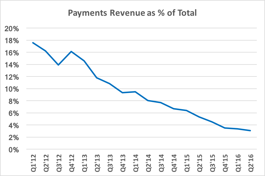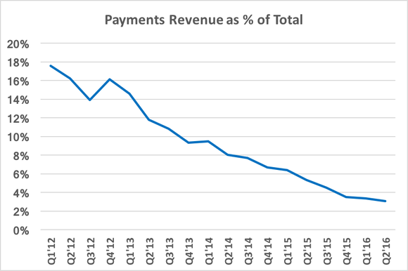 Payments revenue has been slowly trending down for years, representing a smaller and smaller part of the business as mobile ad sales skyrocket. It's now just 3% of revenue.
