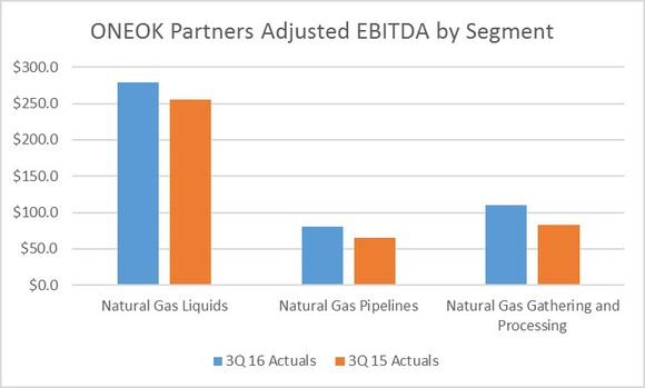 Midstream general partner ONEOK (OKE +1.51%) continues to benefit from the growth of its master limited partnership, ONEOK Partners (OKS +0.00%), which completed construction of several fee-based assets this year. Those new additions fueled a 12% jump in ONEOK's net income, while its adjusted EBITDA rose 15%. Meanwhile, earnings growth at the MLP was even stronger, due to across-the-board improvements at all three of its operating segments: