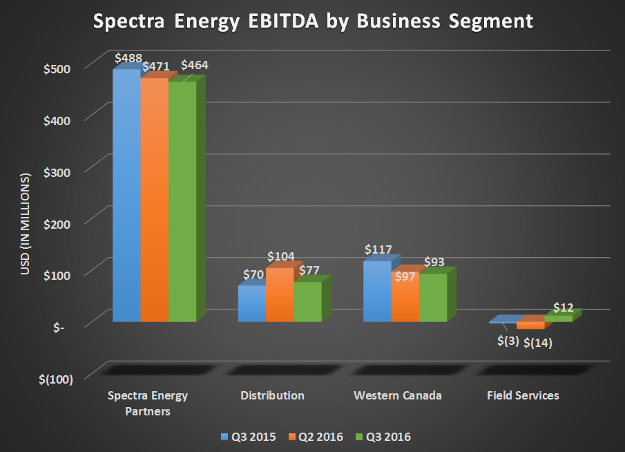 What really brought those earnings over the top, though, was the transfer of two longer-haul NGL pipelines from Spectra Energy Partners (SEP +0.00%). The profits generated from those pipes were also part of the reason why earnings before interest, taxes, depreciation, and amortization (EBITDA) at Spectra Energy Partners was lower.