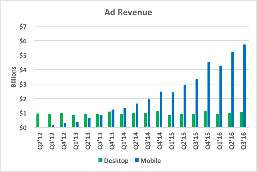 When you look at it like this, it becomes clear that desktop-based ad revenue is fairly stagnant, albeit stable. Revenue fluctuates within a predictable range, but can now be viewed as an incremental side business on top of the core mobile ad business. Put another way, Facebook has generated $4.1 billion in desktop ad revenue on a trailing-12-month basis. The social network did $5.7 billion in mobile ad revenue last quarter alone. Pretty incredible if you ask me.