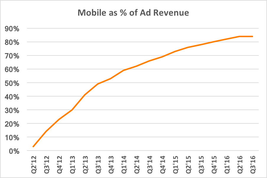 A couple years ago, Facebook began disclosing what percentage of ad revenue was coming from mobile ads. This started out at a paltry 3% of ad sales in Q2 2012. Last quarter, it was 84%. If you wanted to track this percentage over time, this is what it would look like: