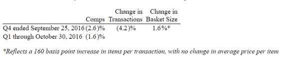 Essentially, the company saw less frequent visits from its customers, but this was partially offset by bigger purchases, with zero decline in average price per item.