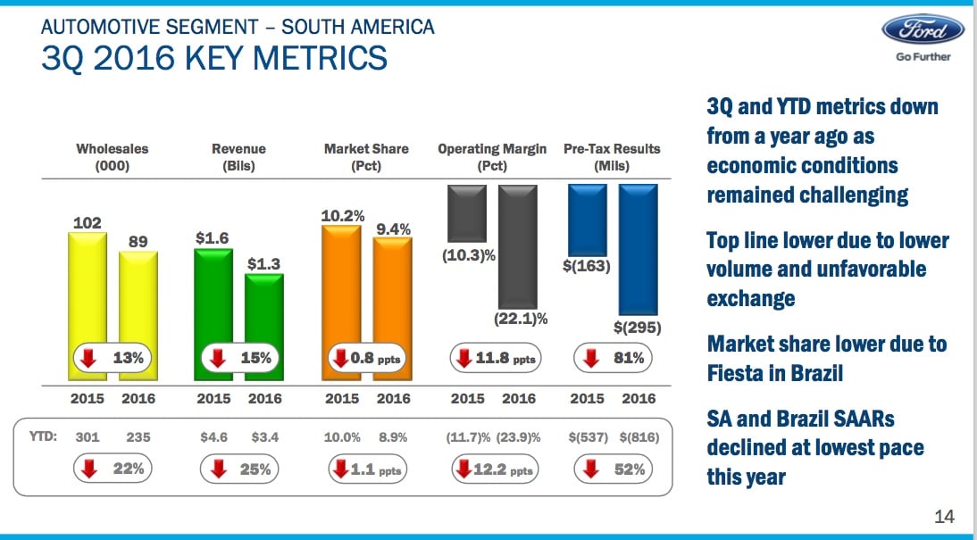You can see both for the third quarter and year-to-date, all the metrics were lower. This is driven by the external conditions in South America, which remain challenging. If you look at the metrics, the top line [revenue] was lower. That was driven both by [sales] volume and by the weaker currencies. Our market share was lower. That was due to Fiesta in Brazil. And in terms of SAAR ["seasonally adjusted annualized rate", a metric showing the pace of auto sales], South America itself was down 400,000 units or 10%. That was entirely driven by Brazil, which was down 400,000 units or 17%.