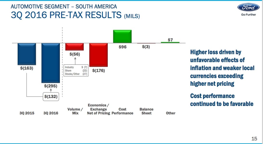 Shanks reiterated Ford's previous guidance for South America: It expects its full-year loss in the region to be greater than the $832 million it lost in 2015. But he hinted that the light at the end of the tunnel might be starting to come into view. Shanks stated:
